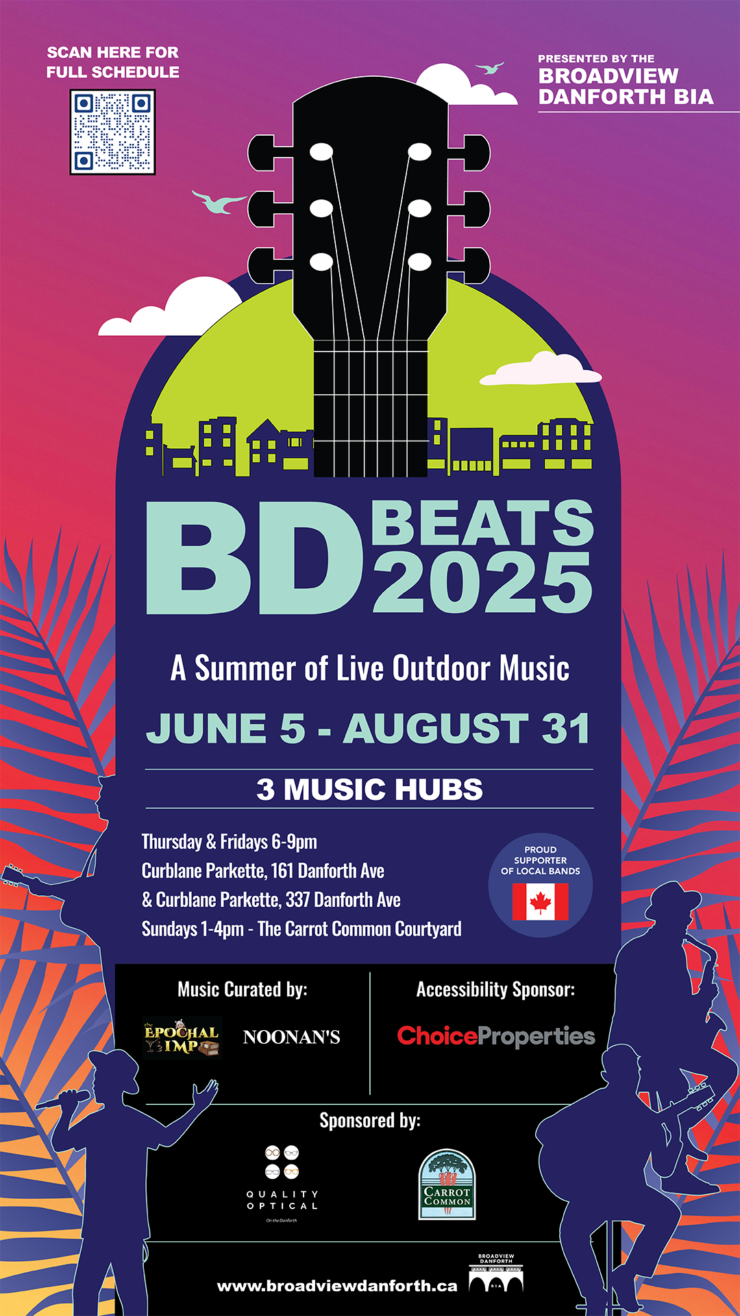 This BD Beats program is a large endeavour with almost 300 musicians playing throughout the 3 months. I want to extend a huge thanks to Jane (Noonan's owner) and Mandy (Epochal Imp) for taking on the task of scheduling the bands. I also want to thank our sponsors who generously help support the series: Choice Properties (a division of Loblaws/No Frills), The Carrot Common and Quality Optical. All of our sponsors are part of our BIA.