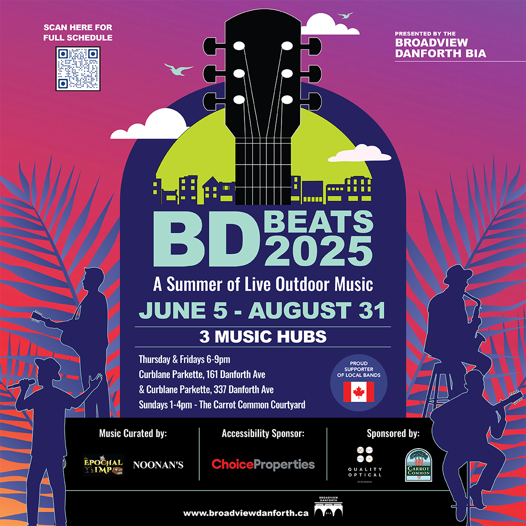 BD Beats will run from now through to Sunday, August 31 (Labour Day weekend) with bands playing every Thursday and Friday nights from 6pm to 9pm on the CafeTO patios located in front of Papyrus Restaurant between Bowden and Hampton Aves, and on the SideBar Restaurant patio and Sunday afternoons from 1pm to 4pm in the Carrot Common courtyard.