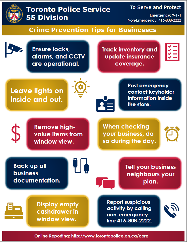 "As the province goes into its second state of emergency and complete lockdown, 55 Division has developed a crime prevention and enforcement plan to address Commercial Break and Enters in three major hot spots within the Division, Danforth Ave., Queen St. and Gerrard St. We will increase the number of patrols in the area and have uniform and plainclothes officers dedicated to these areas. As you may recall from the last State of Emergency back in April 2020, our Project was very successful with the arrest of several individuals. "