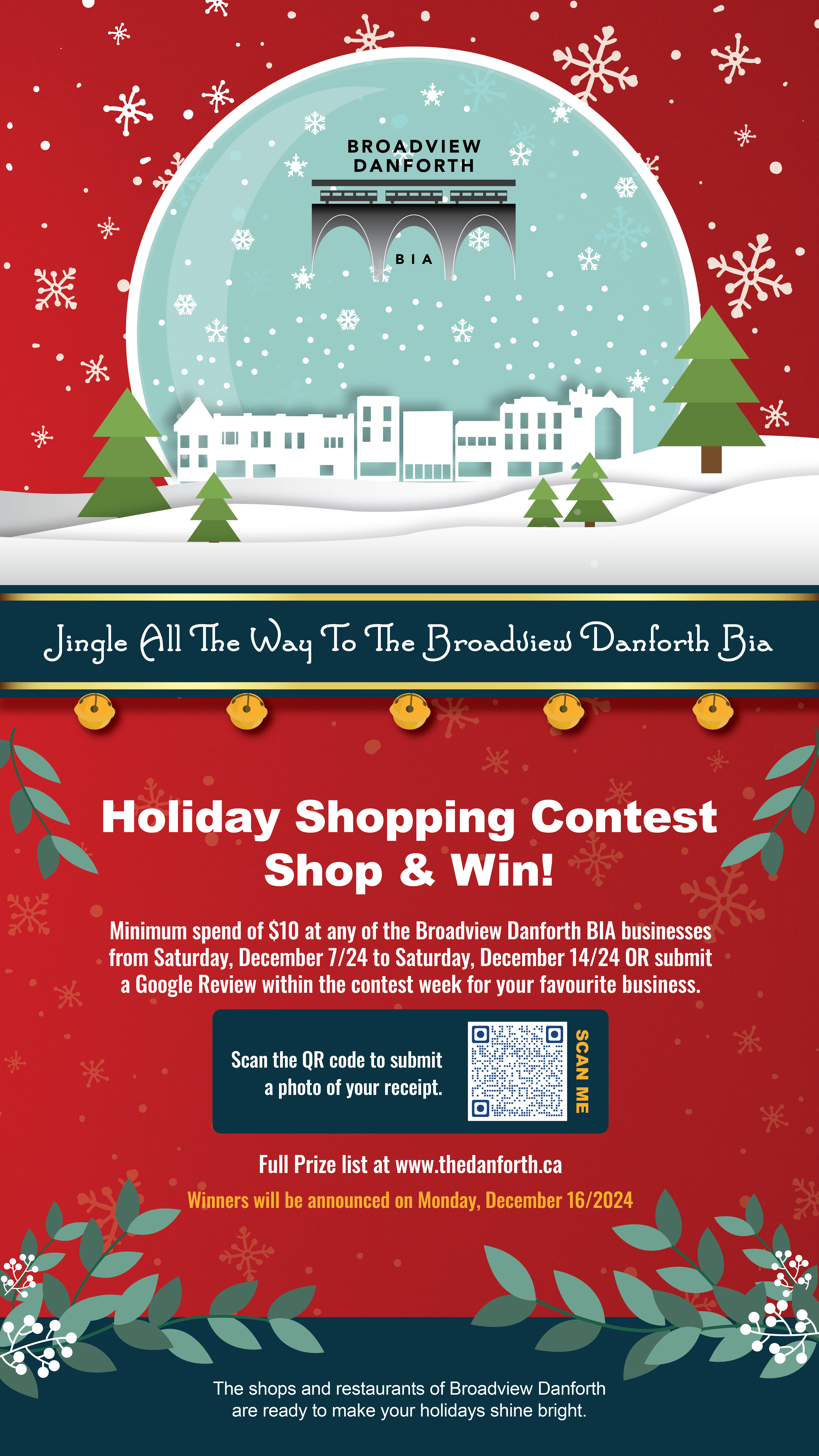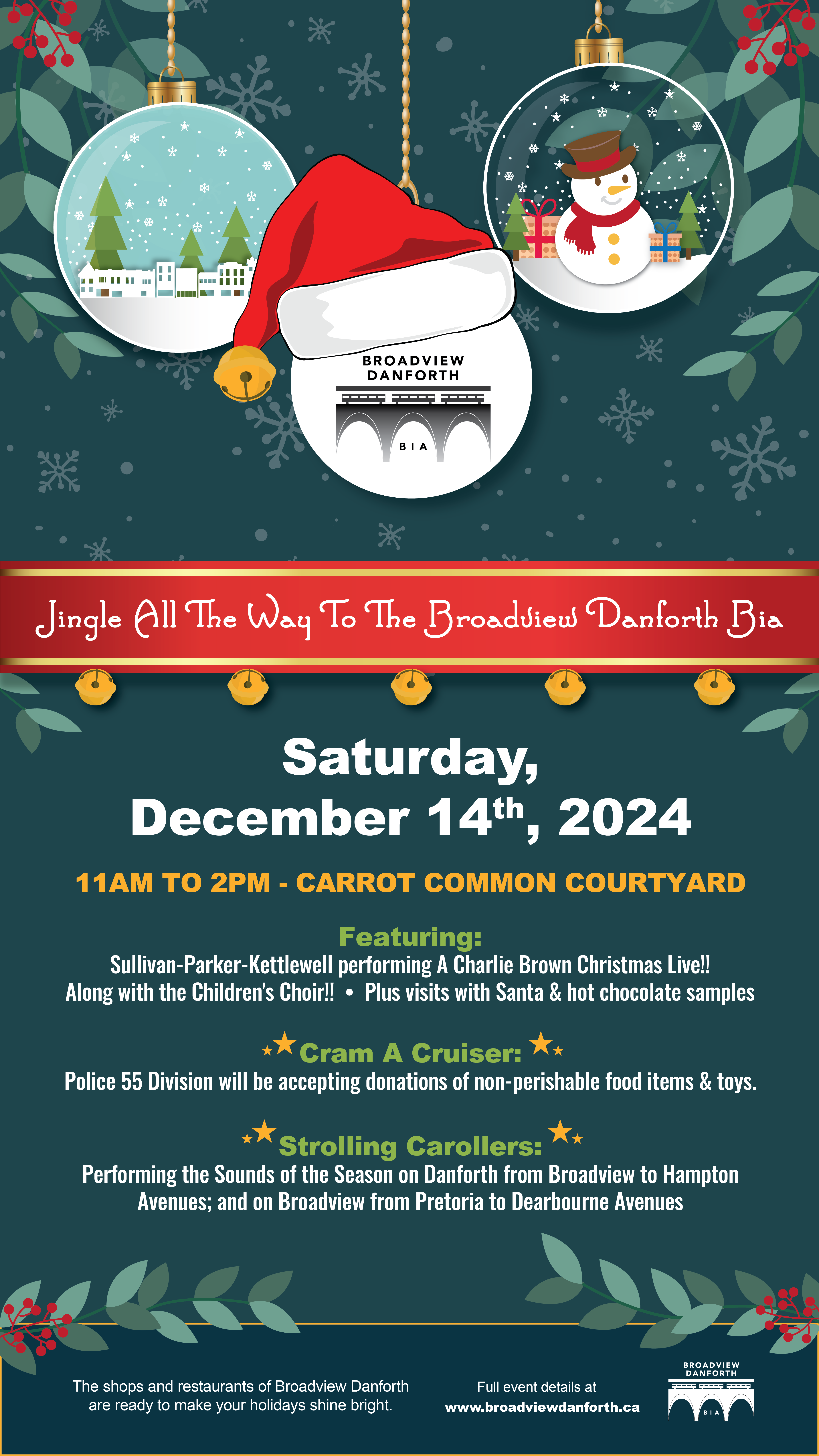 It's one week until our annual Holiday Event - Jingle All The Way To The Broadview Danforth BIA. Next Saturday, Dec. 14th from 11am to 2pm we will be offering the following activations: