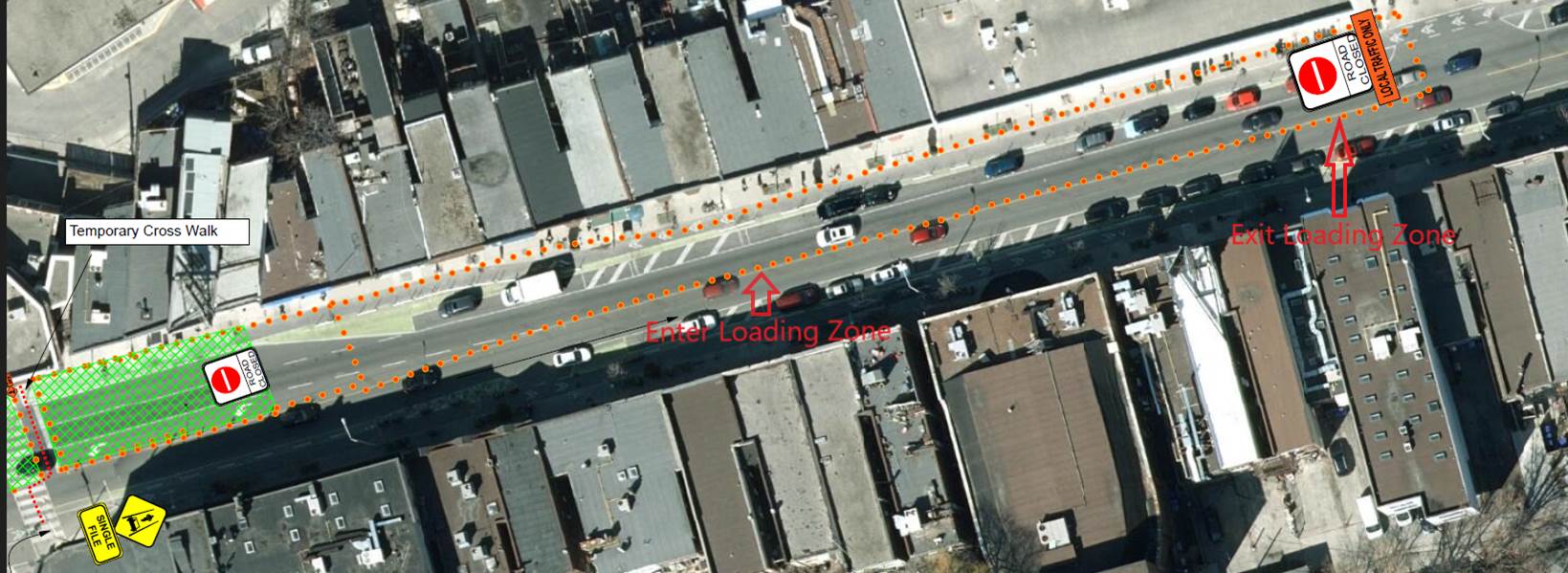 The City's team have arranged to have off-duty Toronto Police along with traffic control people (aka flag people) to be stationed in the immediate area. The traffic control people will move the barrels to allow for entry of delivery trucks into the closed north side travel lane to be able to stop and load/unload.  Toronto Police and traffic control will be on-site from 7 a.m. to 11 p.m. Monday to Friday to assist with this activity. We are also arranging for traffic control to be on-site on Saturdays and Sundays to help facilitate weekend deliveries but need to confirm the expected timing of deliveries to the businesses.  You are being asked to let your delivery services know that they should enter this section of Danforth heading eastbound from the bridge.  If they try a westbound approach they won't be able to make a u-turn in order to exit the area.